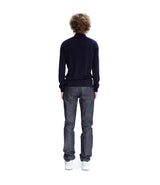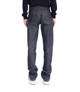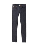 A.P.C. Japanese raw denim. Very stiff fabric that wears in over time. Unisex jeans. the Petit New Standard Jeans have a very tight leg fitted at the bottom. Straight mid-rise. Five pockets, button fly. The first button is engraved "A.P.C. rue Madame près du Luxembourg".