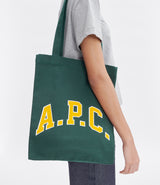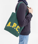 A.P.C. Vertical totebag in heavyweight burgundy canvas with varsity style"APC" Screenprint.