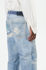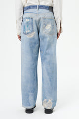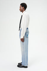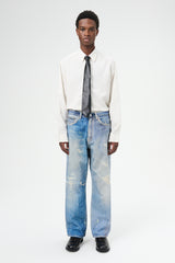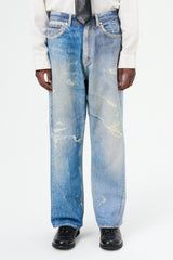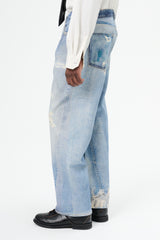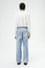 Our Legacy Third Cut Jeans in Digital Denim Print. Produced in an Italian denim with a trompe l'oeil vintage denim print, the mens Third Cut jeans have a relaxed, wide legged fit and feature a YKK zip fly, metal rivets and reinforced back pockets.