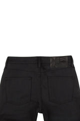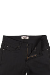 12oz black power stretch denim is dyed black on both the warp and weft for a solid black color tone. The dye is resistant to fading to ensure the jeans stay blacker longer. Made with 5% stretch for increased comfort and incredible stretch recovery performance that allows the jeans to snap back to shape wear after wear.
