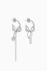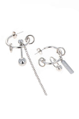 PAIR OF SILVER-TONE MISMATCHED MEDIUM THICK OPEN HOOPS WITH CHARMS.