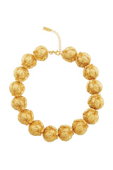 ‘Lovers’ that meet each other to embrace the clavicle — this collar necklace embodies the beautiful textures of the orecchiette from which they were casted in gold plated bronze and it’s adjustable to fit the neck perfectly.