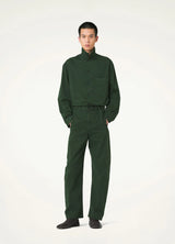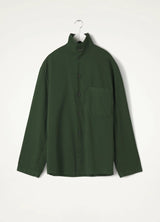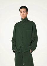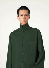 It has a boxy fit with a soft construction and a convertible stand collar. Other details include a chest patch pocket, a French placket, and a button on the sleeves that can be adjusted to create a single pleat