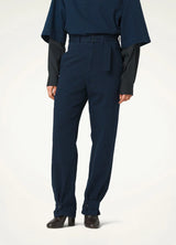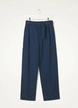 Their relaxed, mid-rise cut can be adjusted at the waist with the matching belt, and at the hem with buttoned tabs, tapering in their volume.