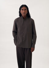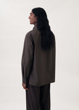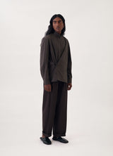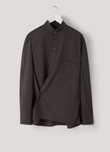 This shirt is made of a cotton poplin that is lightweight with a slightly satin finish. Its adjustable fit is inspired by Lemaire’s classic twisted theme, allowing the front to be worn straight or with its volume shifted to the side. Its details include an officer collar and a button placket which can be closed over the hip, wrapping around the waist.