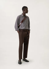 A single chest patch pocket, adjustable angled cuffs with double pleats, and a back yoke complete its classic details.