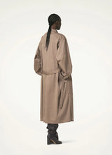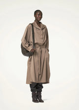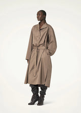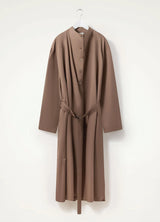 Its generous volume can be adjusted using the matching belt and it opens partially down the front with a buttoned french placket, and along the sides with long slits.