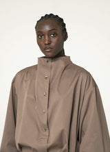 This dress is made of light cotton twill with a soft hand that is slightly shiny and a smooth drape.