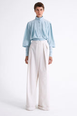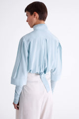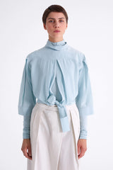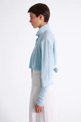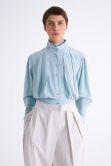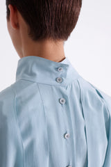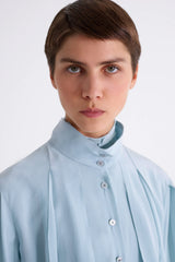 This shirt is made of from a washed silk crepe with a fresh, fluid touch. It features a long neckline, a pleated front and a belted, cinched waist creating a boxy shape. The sleeves are ample and three quarter-length. It can be worn back to front. Boxy fit, long collar, back yoke, stitched pleats. Knotted belt, mother-of-pearl button detail with adjustable waistline. Silk crepe woven in Italy.