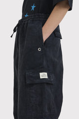 These cargo pants are designed with a drawstring at an elasticized waistband, two large pockets at sides and back and drawstrings at the bottom of both legs.