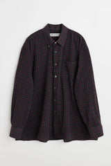 Our Legacy Borrowed BD Shirt Sophomore Check Rural Wool. Produced in a checked ltalian wool blend fabric, the mens Borrowed Shirt has a wide oversized cut and features smoke mother of pearl buttons, a buttoned down collar, a single chest pocket, mitered cuffs, and a curved hem.