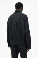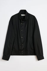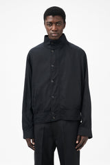 This Our Legacy Mock Bomber in Draping Black Lyocell. Produced in Portuguese lyocell fabric, the men's Mock Bomber has a relaxed fit and features a funnel neckline, pleated waistband and cuffs that create soft flow and volume, and horn buttons.