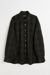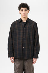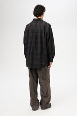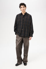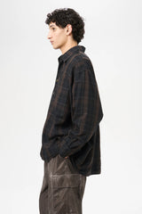 This Borrowed Shirt in Black Sheer Shadow Check. Produced in a delicate Japanese polyester and cotton blend checked fabric, the lined mens Borrowed Shirt has a wide oversized cut and features mother of pearl buttons, a single chest pocket, mitered cuffs, and a curved hem.