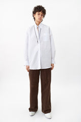 Our Legacy Less Borrowed Shirt in Blue Crinkled Stripe. Produced in a crinkled Portuguese cotton blend fabric, the mens Less Borrowed Shirt has a slightly oversized cut and features mother of pearl buttons, a single chest pocket, mitred cuffs and a curved hem. The Less Borrowed shirt also features hidden snap buttons under the collar.