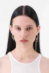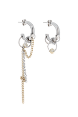 ONE EARRING FEATURES A SMALL RING ACCENTED WITH A PALE GOLD BALL BEAD. THE OTHER FEATURES A RHINESTONE-ENCRUSTED CHAIN PAIRED WITH A PALE GOLD CHAIN, DETAILED WITH VARIOUS KNOTS.