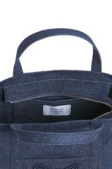 •Small tote bag in denim•Hand, shoulder or cross-body carry•Two small handles•Detachable and adjustable strap with engraved clasps and buckle•Front patch pocket with tonal Fox Head embroidery•Tonal Maison Kitsuné Handwriting signature embroidered on the back•Zip fastening with engraved Profile fox puller•Internal patch pocket•Cotton lining•Dimensions: 22 x 15 x 7.5 cm
