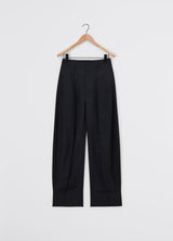 The balloon-like silhouette of the oversized leg is created by a pleat and a seam running down the tapered hem to maintain both volume and structure.