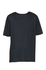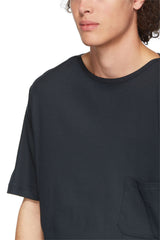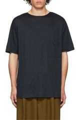 Short sleeve rib knit mercerized cotton jersey t-shirt in navy. Boat neck collar. Patch pocket at chest.