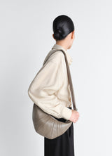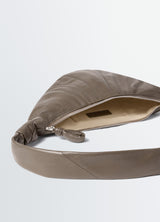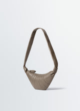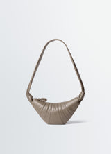 Inspired by the iconic Croissant line, the Fortune Croissant bag introduces a new silhouette for hand and shoulder carrying. Its half-moon look is achieved through an assembly of topstitched panels, enriched by knotted elements. This mini bag is crafted in soft, supple nappa lambskin leather, characterized by its smooth hand and natural shine, LWG Gold certified.