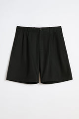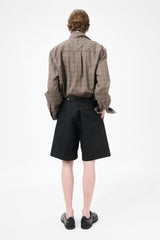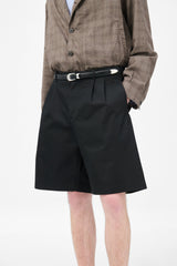 Our Legacy Ponte Shorts in Tasteful Black Megatwist Twill. Produced in Italian cotton twill fabric with a subtle sheen finish, the men's Ponte Shorts have a relaxed, wide fit with double pleats into the waist and no side seam, creating a generous silhouette that finishes at the knee. Features include a YKK zip fly, front welt pockets, horn buttons, darted construction for shape, and welt back pockets.