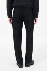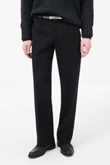 This Slack Trouser in Coarse Black Gabardine. Produced in Italian virgin wool fabric, the men's Slack Trouser has a relaxed fit with a lower rise and features a hidden closure, pleats at the waist, pre-constructed waistband, and a slight bootcut silhouette.