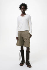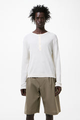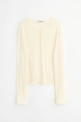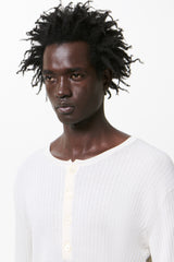 ThisFine Henley in Ivory Cotton Crepe. Produced from Italian superior cotton crepe yarn in a fine gauge, this relaxed knit features an eight-by-one rib that nods to vintage military undergarments.