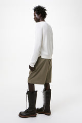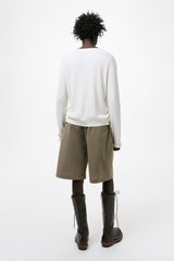 This garment is manufactured using a carefully sourced yarn whose natural characteristics, combined with the knit construction, allow the piece to expand when worn. The garment shall be shaped by its wearer and naturally distress over time to finish the design process. To help keep the integrity of the garment please store the garment folded.