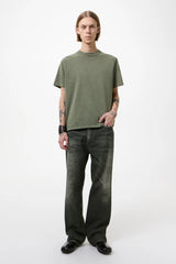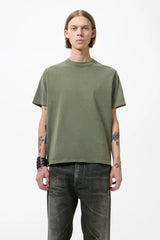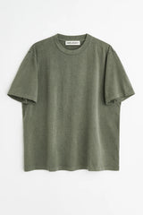 This Box T-Shirt in Worn Olive Legacy Jersey. Produced in a Portuguese cotton jersey with a pigment-dyed, fade-out finish, the Box T-Shirt has a relaxed, boxy fit and features a ribbed collar and a straight hem, delivering a soft hand and lived-in character with subtle color variations.