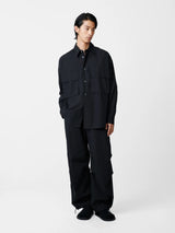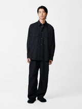 Frame’s wide, boxy shape accommodates two large patch-flap pockets on the shirt’s front. Constructed in a bellows style, the pockets have exaggerated volume which creates a striking visual effect.