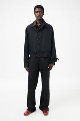 This Our Legacy Mock Bomber in Draping Black Lyocell. Produced in Portuguese lyocell fabric, the men's Mock Bomber has a relaxed fit and features a funnel neckline, pleated waistband and cuffs that create soft flow and volume, and horn buttons.