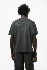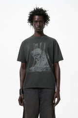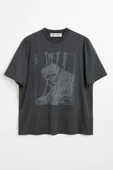 This Box T-Shirt in Portuguese Cotton Jersey. Produced in a Portuguese cotton jersey, the Box T-Shirt is pigment dyed and laser printed to burn out the color, revealing our Angry Fan Mail graphic, a satirical nod to social media commentary. It has a wide, boxy fit and features a fine rib collar and a straight hem.