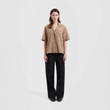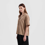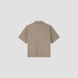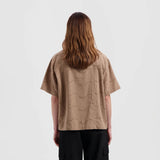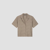 The shirt is designed with a boxy fit, a button-front closure, a camp collar, and dropped shoulders.