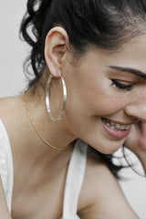 A happy medium at 6 cm diameter — a complete circle, flat hoops light enough to wear all day. Handmade in recycled silver with an understated matt finish. Designed to pull open and to the side, in one clean circular form. Flirts well with PYAR's mini hinged hoops on ears with multiple piercings.