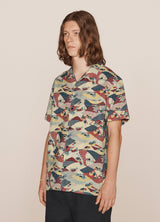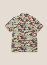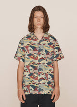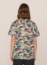 YMC Short sleeved Cuban collar shirt in a pure cotton seersucker with an idyllic seasonal print.