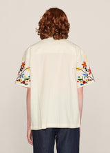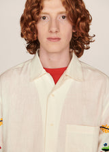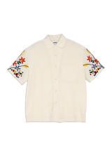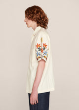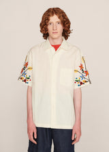 YMC Floral Idris Shirt is the statement relaxed summer shirt in an Indian cotton flax blend fabric that is breathable and light-weight. Features a crochet style stitch Floral embroidery on both sleeves.